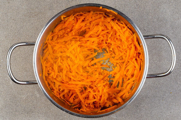 400ml Wasser in einem Wasserkocher aufkochen. Tipp: Die nach Wasserkocher variierende Mindestmenge beachten und ggf. mehr Wasser aufkochen. Die Karotte ggf. schälen und grob raspeln. Den Knoblauch schälen und fein würfeln. Die 1/2 des Knoblauchs mit den Karottenraspeln in einem mittelgroßen Topf mit 1EL Pflanzenöl bei mittlerer Hitze ca. 2Min. vorgaren.