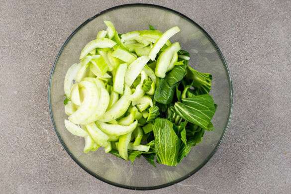 Inzwischen den grünen Teil des Pak Choi in grobe Streifen, den weißen Teil in ca. 1cm dicke Scheiben schneiden, dabei den Strunk entfernen.