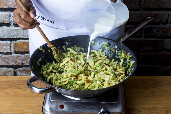 Die Spätzle hinzugeben und 3–4Min. mitbraten, dann mit der Milch ablöschen und ca. 1Min. leicht einköcheln lassen. Mit Salz und Pfeffer würzen.