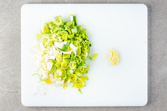 Den Lauch längs halbieren und quer in feine Streifen schneiden. Den Knoblauch schälen und fein würfeln.