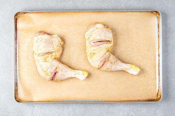 Das Fleisch auf ein mit Backpapier ausgelegtes Backblech geben und im oberen Teil im ggf. noch vorheizenden Ofen 30–40Min. goldbraun und gar backen.