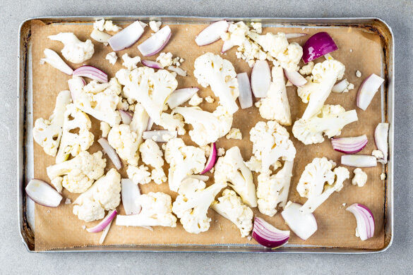 Den Blumenkohl in mundgerechte Röschen schneiden. Die Zwiebel schälen, halbieren und in dünne Spalten schneiden. Das Gemüse auf einem weiteren mit Backpapier ausgelegten Backblech mit 1EL Olivenöl und je 1 Prise Salz und Pfeffer vermengen und im unteren Teil im Ofen in 15–18Min. goldbraun backen.