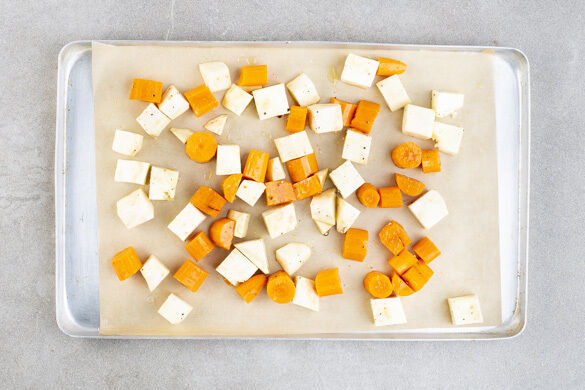 Den Sellerie und die Karotten auf einem mit Backpapier ausgelegten Backblech mit 1–2EL Olivenöl, 1/2TL Salz und 1 kräftigen Prise Pfeffer vermengen, gleichmäßig verteilen und 20–25Min. im Ofen rösten, bis das Gemüse goldbraun und gar ist. Nach der Hälfte der Zeit wenden. Tipp: Je nach Größe des Backblechs ggf. ein zweites Blech verwenden.