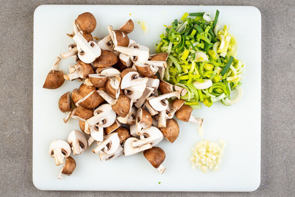 Den Lauch längs halbieren, quer in feine Streifen schneiden und in einer großen Pfanne mit 1EL Olivenöl bei mittlerer bis starker Hitze in ca. 2Min. goldbraun anbraten. Mit je 1 Prise Salz und Pfeffer würzen. Inzwischen die Pilze ggf. säubern und je nach Größe halbieren oder vierteln. Den Knoblauch schälen und fein würfeln. Die 1/2 des Lauchs für die Garnitur beiseitestellen.