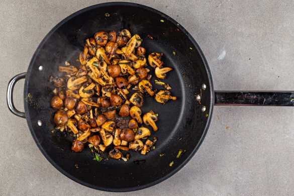 Die Pilze zu dem restlichen Lauch in die Pfanne geben und ca. 2Min. mitbraten, dann den Knoblauch und die 1/2 des Brühgewürzes einrühren. Die Pilze abgedeckt bei niedriger Hitze in 7–8Min. weich garen.