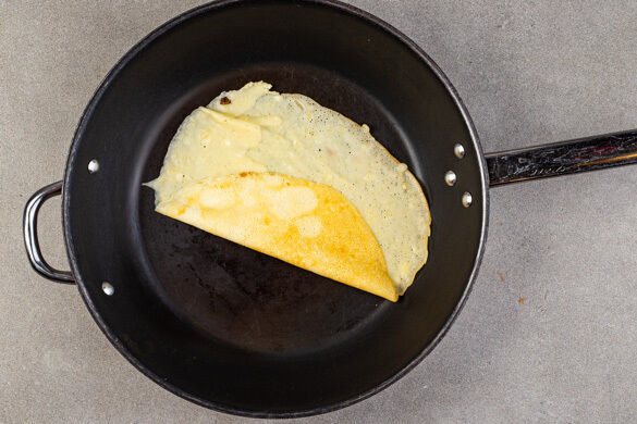 In einem kleinen Topf 50g Butter langsam schmelzen, vom Herd nehmen und zuerst mit der Milch, dann mit 1 Ei verquirlen. 120g Mehl, 1TL Salz und 1/2TL Zucker in eine große Schüssel geben. Im Mehl eine Mulde formen, die Milch-Mischung sowie 50–80ml Wasser hineingießen und alles gut verrühren. Die Konsistenz sollte der von flüssiger Sahne gleichen. Den Teig kalt stellen.