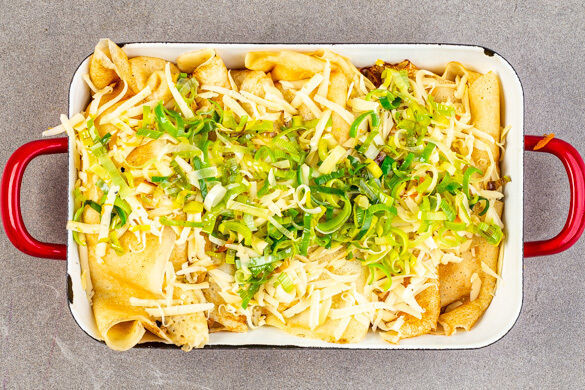 Kennst du Blini? Sie sind die osteuropäische Antwort auf unsere heiß geliebten Pfannkuchen und werden je nach Gusto mit herzhaften oder süßen Füllungen zubereitet, aufgerollt und im Nu verputzt. Zu unserem Februar-Special haben wir uns eine köstliche, cremige Füllung aus Hähnchen, Lauch und Pilzen einfallen lassen. Für extra Genuss werden die aufgerollten Blini mit Käse überbacken. Was für ein Schmaus!