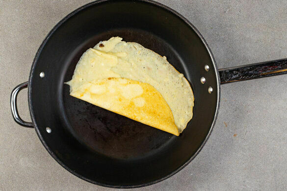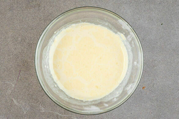 In einem kleinen Topf die Butter langsam schmelzen, vom Herd nehmen und zuerst mit der Milch, dann mit 2 Eiern verquirlen. 285g Mehl, 2TL Salz und 1TL Zucker in eine große Schüssel geben. Im Mehl eine Mulde formen, die Milch-Mischung sowie 100–150ml Wasser hineingießen und alles gut verrühren. Die Konsistenz sollte der von flüssiger Sahne gleichen. Den Teig kalt stellen.