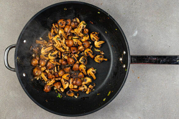 Die Pilze zu dem restlichen Lauch in die Pfanne geben und ca. 2Min. mitbraten, dann den Knoblauch und das Brühgewürz einrühren. Die Pilze abgedeckt bei niedriger Hitze in 7–8Min. weich garen.