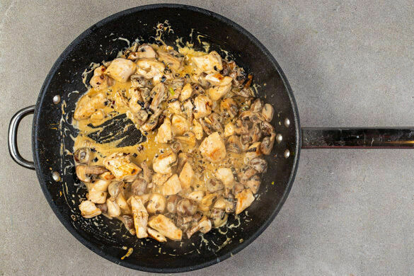 Den Backofen auf 200°C (180°C Umluft) vorheizen. Das Fleisch trocken tupfen und in ca. 1cm kleine Würfel schneiden. Mit 1EL Olivenöl zu den Pilzen in die Pfanne geben und bei mittlerer Hitze 2–3Min. braten. Ggf. den Bratensatz mit etwas Wasser lösen, dann 2EL Mehl, die Crème fraîche und 2TL Senf unterrühren und die Sauce leicht andicken lassen.