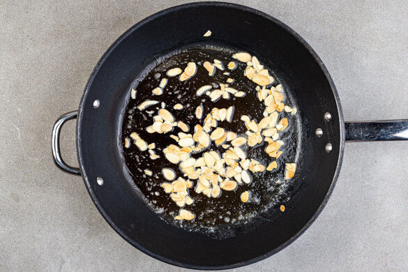 600ml Wasser in einem Wasserkocher aufkochen. Die Mandelblättchen in einer mittelgroßen Pfanne mit 1TL Butter und 1 Prise Salz bei mittlerer Hitze 3–4Min. goldbraun anrösten. Vorsicht, sie können schnell zu dunkel werden. Zum Abkühlen aus der Pfanne nehmen und beiseitestellen. Die Pfanne aufbewahren.