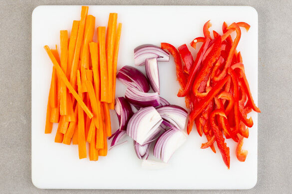 Den Backofen auf 240°C (220°C Umluft) vorheizen. Die Paprika vierteln, entkernen und in dünne Streifen schneiden. Die Karotte ggf. schälen, längs halbieren und in dünne, pommesartige Stifte schneiden. Die Zwiebel schälen, halbieren und in Spalten schneiden.