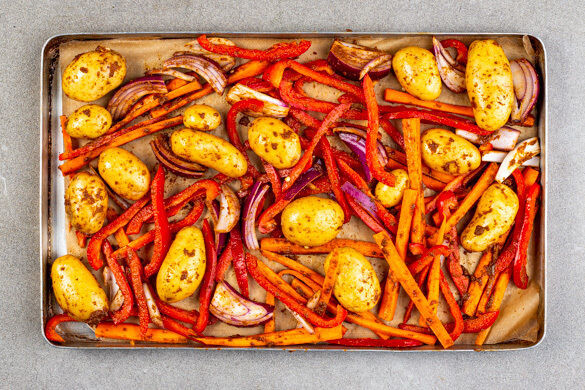 Heute zeigen wir dir, wie du die Geschmackswelt Indiens ganz bequem in nur einer Auflaufform zu dir nach Hause bringst: Paprika, rote Zwiebeln, Drillinge und geräucherte Hähnchenstreifen erhalten ein pikant duftendes Bad in rötlich schimmernder Tikka-Masala-Paste. Während sie im Ofen schmurgeln, bereitest du süßsauer eingelegte Gurken zu, die mit fruchtiger Mangosalsa würdige Begleiter zu deinem „One Tray Wonder“ sind.