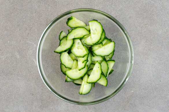 Die Gurke längs halbieren und quer in dünne Scheiben schneiden, dann mit 1EL hellem Essig und je 1 Prise Salz, Pfeffer und Zucker vermengen.