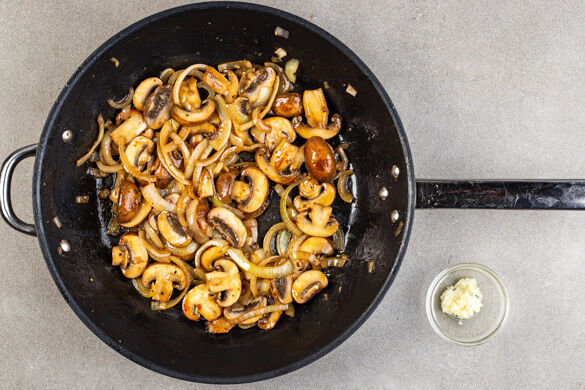 Die Pilze und die Zwiebeln in einer mittelgroßen Pfanne mit 2EL Butter bei mittlerer bis starker Hitze in 7–9Min. goldbraun braten. Inzwischen den Knoblauch schälen und sehr fein würfeln oder durch eine Knoblauchpresse drücken.