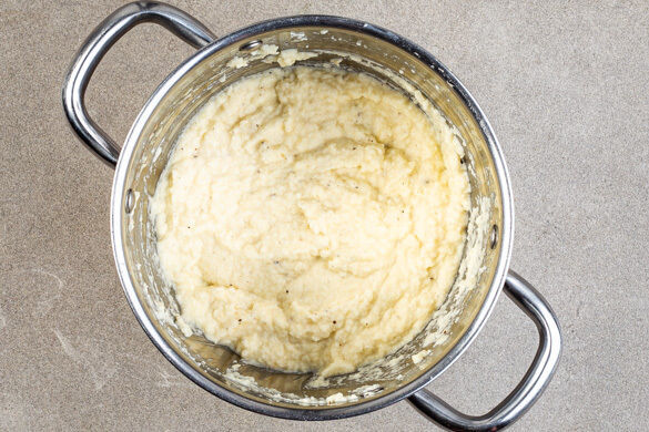 Mit einem Messbecher 150ml Kochwasser abschöpfen, dann den Knollensellerie in ein Sieb abgießen und zurück in den Topf geben. Die restliche Crème fraîche und das Kochwasser zugeben, anschließend den Knollensellerie mit einem Stabmixer cremig pürieren. Das Püree mit Salz und Pfeffer abschmecken.