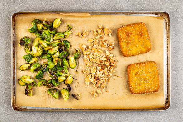 Den Backofen auf 240°C (220°C Umluft) vorheizen. In einem mittelgroßen Topf ausreichend gesalzenes Wasser für den Knollensellerie zum Kochen bringen. Den Rosenkohl vierteln und mit den Pattys auf ein mit Backpapier ausgelegtes Backblech geben. Mit 1EL Pflanzenöl beträufeln, mit je 1 Prise Salz und Pfeffer würzen und 12–14Min. im Ofen goldbraun rösten.