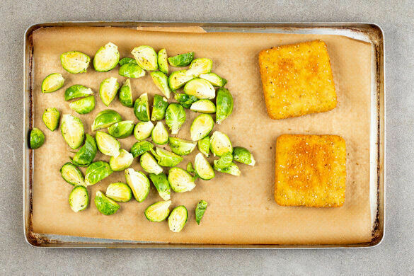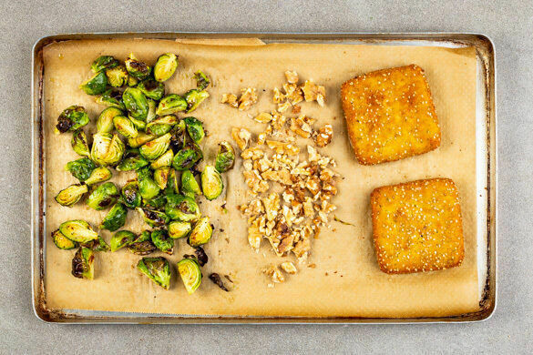 Den Backofen auf 240°C (220°C Umluft) vorheizen. In einem großen Topf ausreichend gesalzenes Wasser für den Knollensellerie zum Kochen bringen. Den Rosenkohl vierteln und mit den Pattys auf ein mit Backpapier ausgelegtes Backblech geben. Mit 2EL Pflanzenöl beträufeln, mit je 1 Prise Salz und Pfeffer würzen und 12–14Min. im Ofen goldbraun rösten.