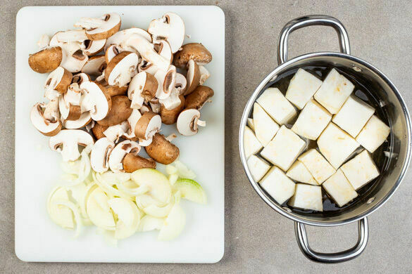 Den Knollensellerie schälen und in 1–2cm große Würfel schneiden. Die Pilze ggf. säubern und in Scheiben schneiden. Die Zwiebeln schälen, halbieren und in feine Streifen schneiden. Den Knollensellerie in das kochende Wasser geben und bei starker Hitze in 12–15Min. weich kochen.
