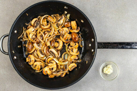 Die Pilze und die Zwiebeln in einer großen Pfanne mit 3EL Butter bei mittlerer bis starker Hitze in 7–9Min. goldbraun braten. Inzwischen den Knoblauch schälen und sehr fein würfeln oder durch eine Knoblauchpresse drücken.