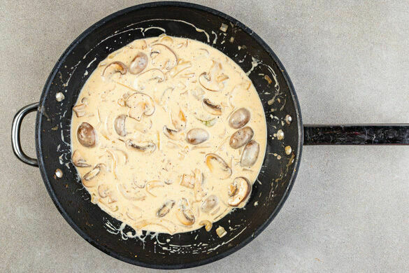 Die Pilze mit je 1 kräftigen Prise Salz und Pfeffer würzen, den Knoblauch untermengen und ca. 30Sek. mitbraten. Die Pilze mit 2EL Mehl bestäuben und 200ml Wasser zugießen. Die Sauce etwas einköcheln lassen, dann 2/3 der Crème fraîche unterrühren, bei niedriger Hitze kurz aufkochen und vom Herd nehmen.
