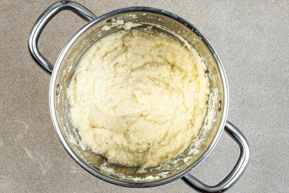 Mit einem Messbecher 250ml Kochwasser abschöpfen, dann den Knollensellerie in ein Sieb abgießen und zurück in den Topf geben. Die restliche Crème fraîche und das Kochwasser zugeben, anschließend den Knollensellerie mit einem Stabmixer cremig pürieren. Das Püree mit Salz und Pfeffer abschmecken.