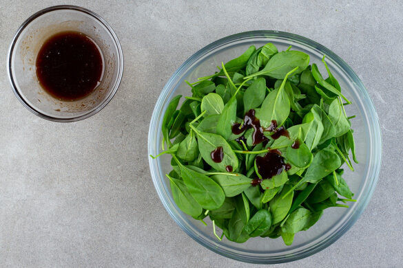 Die Zwiebelmarmelade mit 2EL Olivenöl, 2EL Balsamicoessig, 1–2EL Wasser und je 1 Prise Salz und Pfeffer verrühren. Das Dressing kurz vor dem Servieren mit dem Spinat vermengen. Die Pizzen mit der 1/2 des Spinats garnieren und mit dem übrigen Spinat als Beilagensalat servieren.