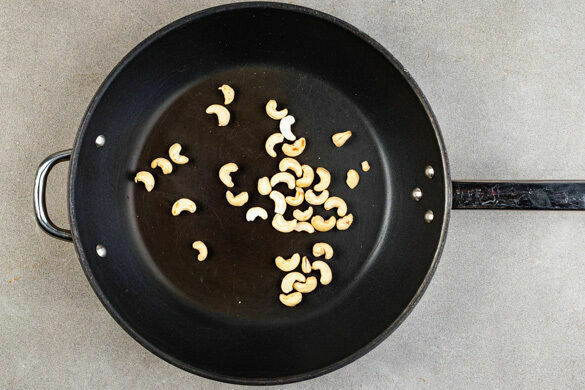 Die Cashews in einer großen Pfanne ohne Zugabe von Fett bei mittlerer Hitze 1–2Min. goldbraun anrösten. Vorsicht, sie können schnell zu dunkel werden. Zum Abkühlen aus der Pfanne nehmen und beiseitestellen.