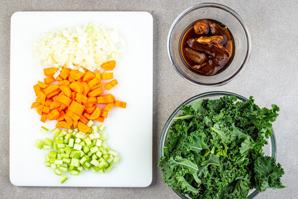 Den Backofen auf 240°C (220°C Umluft) vorheizen. In einem Wasserkocher 500ml Wasser aufkochen. Die Zwiebel schälen und fein würfeln. Die Karotte längs halbieren und in 1–1,5cm dicke Scheiben schneiden. Den Sellerie grob würfeln. Die Grünkohlblätter von den Stielen streifen und die Stiele grob würfeln. Die Shiitake mit dem kochenden Wasser übergießen und beiseitestellen.