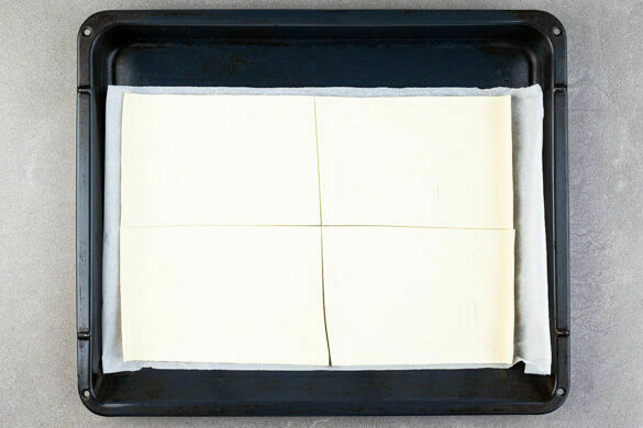 Die Teige mit dem Papier nach unten auf zwei Backblechen ausrollen und in je 4 Rechtecke schneiden.