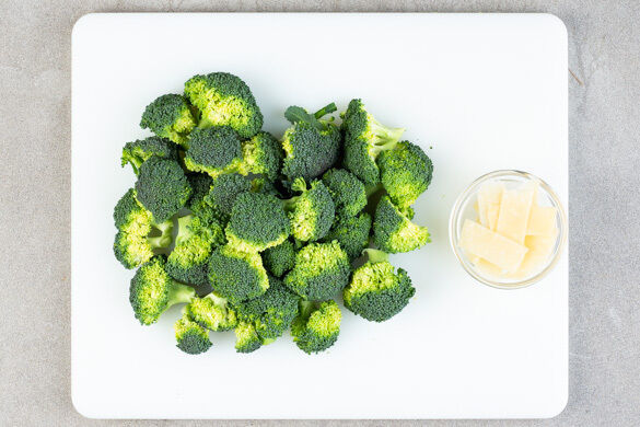 Den Brokkoli in mundgerechte Röschen schneiden. Den Käse mit einem Sparschäler in breite Streifen schneiden.