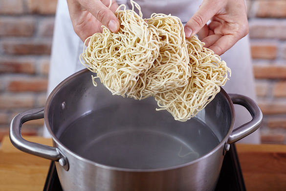 Sobald das Wasser kocht, den Topf vom Herd nehmen, 3/4 der Nudeln ins Wasser geben und in ca. 8Min. bissfest ziehen lassen. Tipp: Wer großen Hunger hat, kann auch alle Nudeln verwenden. Sobald die Nudeln gar sind, in ein Sieb abgießen und abtropfen lassen.