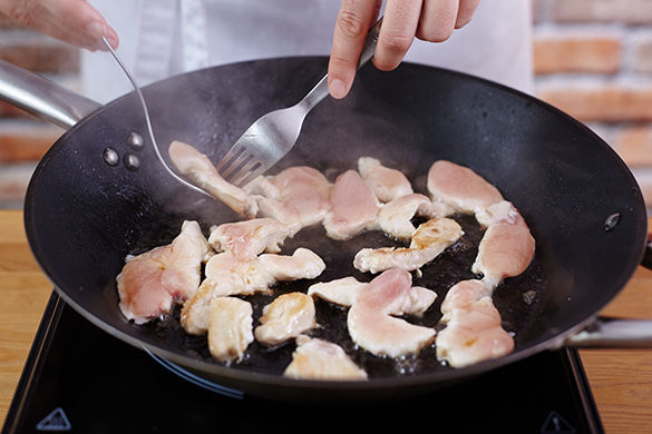 Das Fleisch in einer großen Pfanne bei starker Hitze ca. 2–3Min. scharf anbraten und mit Salz und Pfeffer würzen. Aus der Pfanne nehmen und beiseitestellen.