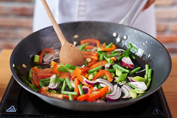 Die Zwiebeln, die Paprika, den Ingwer und die Bohnen in der Pfanne mit 1EL Sesamöl in ca. 5–7Min. bissfest braten, mit Salz und Pfeffer würzen. Das Fleisch und die 1/2 der Teriyakisauce zugeben, einmal aufkochen lassen und noch 2–3Min. sanft köcheln, bis das Fleisch gar ist.