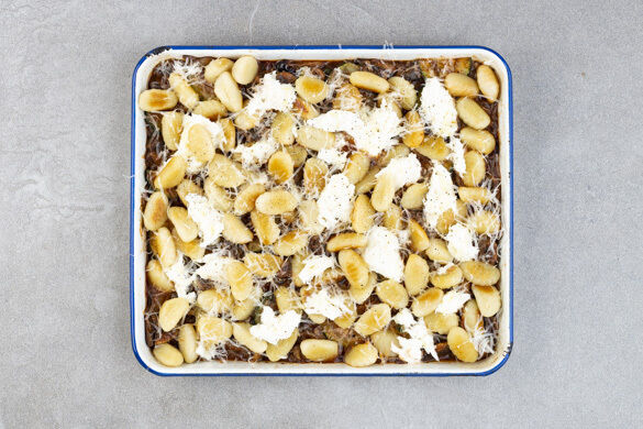 Das Ragout in eine Auflaufform geben und die Gnocchi darauf verteilen. Den Hartkäse fein reiben, die Mozzarellas in grobe Stücke zupfen, beide Käsesorten gleichmäßig auf den Gnocchi verteilen und mit je 1 Prise Salz und Pfeffer würzen. Die Gnocchi 3–4Min. im Ofen überbacken, bis der Käse geschmolzen ist.