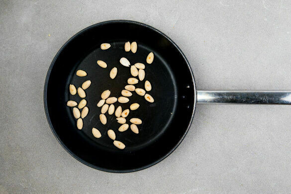 Die Mandeln in einer kleinen Pfanne ohne Zugabe von Fett bei mittlerer Hitze 1–2Min. goldbraun anrösten. Vorsicht, sie können schnell zu dunkel werden. Zum Abkühlen aus der Pfanne nehmen und beiseitestellen.
