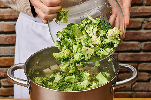 Den Brokkoli nach 10Min. Kochzeit zu den Kartoffeln und der Pastinake in den Topf geben und das Gemüse 5–7Min. kochen, bis alles gar ist. Mit einer Tasse etwas Kochwasser abschöpfen, dann das Gemüse in ein Sieb abgießen, abtropfen lassen und wieder in den Topf geben.