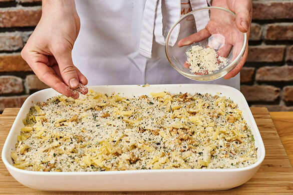 Den Stamppot in einer großen Auflaufform verteilen und mit dem restlichen Käse und den übrigen Walnüssen bestreuen. Das Paniermehl mit dem Rosmarin vermengen und ebenfalls auf dem Stamppot verteilen. Den Stamppot ca. 5Min. im Ofen gratinieren, bis der Käse geschmolzen ist. Mit den gerösteten Zwiebeln garnieren und servieren.