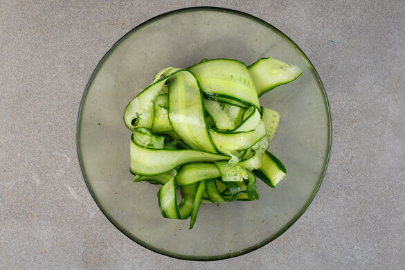 Die Gurke mit einem Sparschäler in breite Streifen schneiden. In einem Sieb mit 1TL Salz vermischen und ziehen lassen. In einer großen Schüssel 1EL hellen Essig und 1EL Zucker verrühren, bis sich der Zucker aufgelöst hat.
