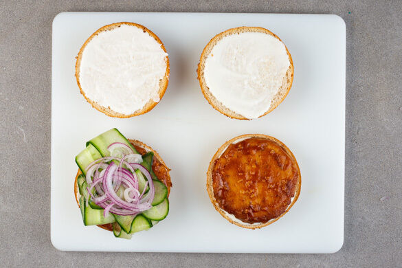 Die Brötchen auf einem Backrost 1–2Min. im Ofen aufknuspern. Anschließend aufschneiden, mit der veganen Mayonnaise bestreichen und mit den Pattys belegen. Die Miso-Würzsauce auf den Pattys verstreichen und mit den Zwiebeln und den Gurken belegen. Die „Chicken“-Katsu-Burger mit den Karottenpommes servieren.