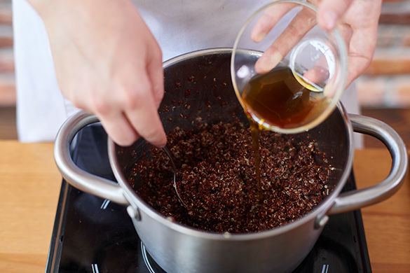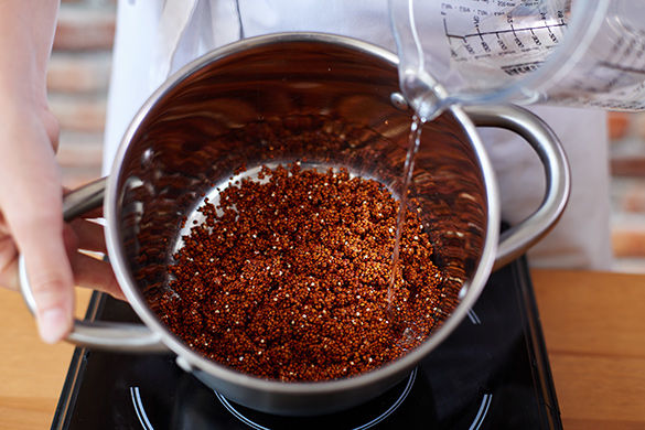 Inzwischen Quinoa in einem Sieb unter kaltem Wasser abspülen. In einen kleinen Topf geben, mit einer Prise Salz würzen und mit 500ml kaltem Wasser bedecken. Zum Kochen bringen, Hitze reduzieren und leicht köchelnd ca. 15-20Min. gar kochen.