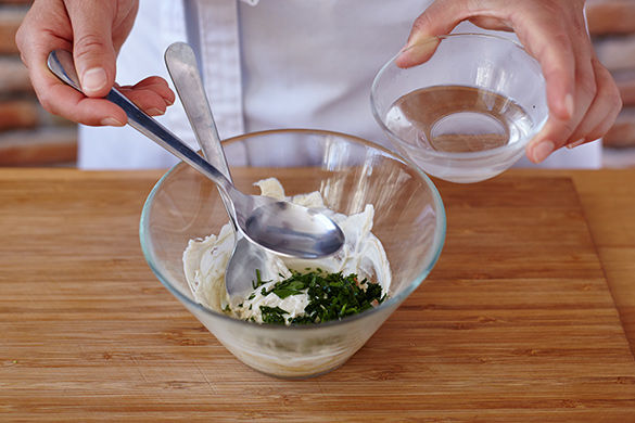 Petersilie waschen, grob hacken und die Hälfte in eine Schüssel geben. Tahini, Joghurt, 1EL Zitronensaft und 1EL Zucker zugeben. Mit Salz und Pfeffer würzen und mit 3-4EL Wasser zu einem Dressing verrühren.