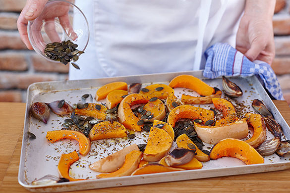 Nach 20Min. Kürbis-Garzeit, die Kürbiskerne über dem Blech mit dem Gemüse verteilen, erneut in den Ofen geben und weitere 10Min. backen.