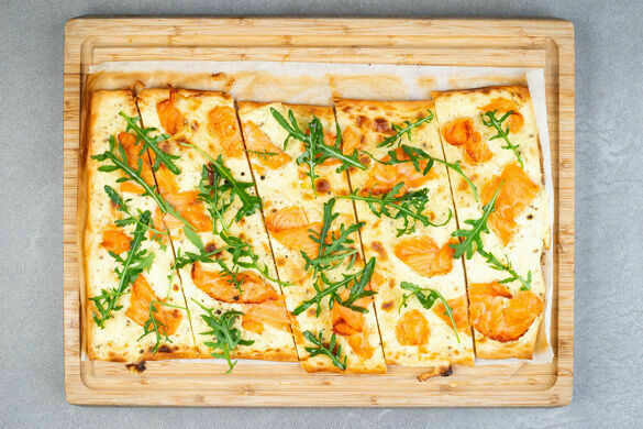 Der Flammkuchen ist ein französischer Klassiker aus dem Elsass und begeistert uns heute als knusprig-krosse Variation mit saftigem Räucherlachs und Crème fraîche. Für die Extraportion Frische sorgt ein knackiger Gurken-Lauchzwiebel-Salat. Bon appétit!