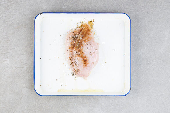 Das Fleisch trocken tupfen, mit 1EL Olivenöl, der 1/2 des Ras el-Hanout und je 1 kräftigen Prise Salz und Pfeffer einreiben und in eine Auflaufform legen.