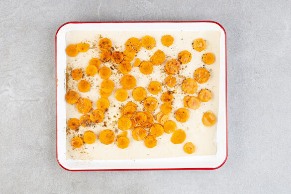 Die Karotte ggf. schälen, in dünne Scheiben schneiden und in einer weiteren Auflaufform mit 1EL Olivenöl, dem restlichen Ras el-Hanout und je 1 Prise Salz und Pfeffer vermengen. Das Fleisch und die Karotten in den Ofen geben und 12–15Min. backen, bis das Fleisch gar ist. In den letzten 2–3Min. die Mandelblättchen neben den Karotten auf das Blech geben und mitrösten.