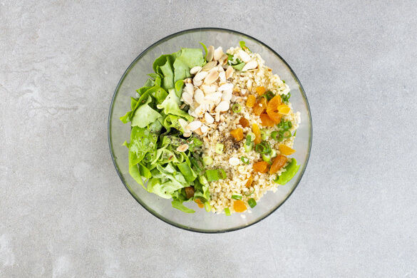 Den Salat vom Strunk befreien und in mundgerechte Stücke schneiden. Die Lauchzwiebel in dünne Ringe schneiden. Den Bulgur mit einer Gabel auflockern und mit den Mandelblättchen, dem Salat, der 1/2 der Lauchzwiebeln, 1EL Olivenöl, 1EL Essig und je 1 kräftigen Prise Salz und Pfeffer vermengen.