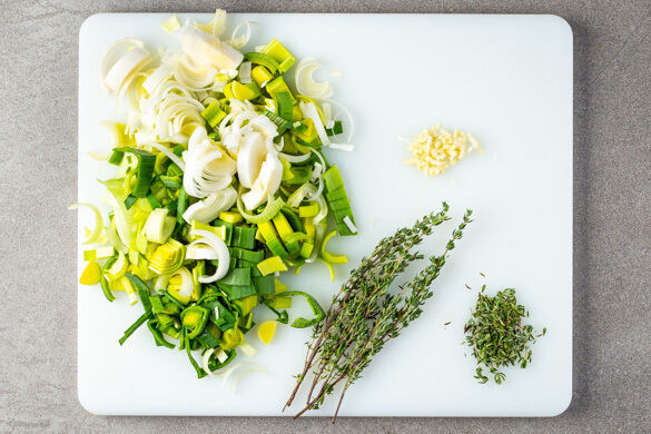 Den Lauch längs halbieren und in feine Streifen schneiden. Den Knoblauch schälen und fein würfeln. Ca. 1EL Thymianblättchen von den Stängeln streifen, die übrigen Thymianzweige intakt lassen.