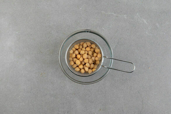 Den Backofen auf 200°C (180°C Umluft) vorheizen. Die Kichererbsen in einem Sieb mit kaltem Wasser abspülen und abtropfen lassen.
