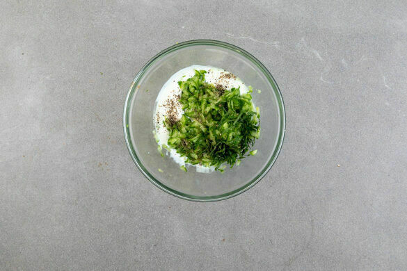 Die Gurke grob raspeln, mit 1 kräftigen Prise Salz vermengen, in ein Sieb geben und ca. 5Min. beiseitestellen. Anschließend mit den Händen so viel Flüssigkeit wie möglich auspressen. Die Minze von den Stängeln zupfen und fein schneiden. Den Joghurt mit der Gurke und der 1/2 der Minze vermengen. Mit Pfeffer und ggf. etwas Salz abschmecken.
